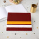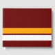 Este diseño deportivo presenta audaces rayas de carreras de borde dorado amarillo y blanco con fondo rojo intenso.