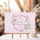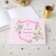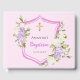 Un fondo rosa suave. Decorada con un escudo rosa, flores rosadas y violetas, flores. Con una cruz dorada. Personalice y agregue un nombre y una fecha. Espina: agrega tu texto.