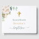 Para un bautismo elegante, neutral en cuanto a género. Un fondo blanco moda. Decorada con flores blancas de color agua (peonía) y hojas de eucalipto verde, brotes, vegetación, hojas falsas de oro. Una falsa cruz de oro. Personalice y agregue el nombre del niño y una fecha. Letras verdes y doradas. Spine: agrega tu propio texto: Atrás: agrega tu propia foto en la parte posterior, nombre y fecha de nacimiento.