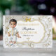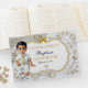 Bella bebé con traje de bautizo. El fondo es satén blanco con un marco purpurina dorado y plateado y adorno de arco. La parte posterior está adornada con una cinta dorada sobre un fondo de satén blanco.