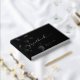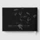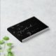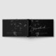 Un elegante y sofisticado libro de bodas negro y plateado que presenta un fondo negro con detalles clásicos de hojas de acanthus negras con caligrafía de Relieve metalizado plateado con sus nombres en la parte delantera, columna vertebral y cubierta trasera en un moderno tipo san serif. El libro en la parte delantera dice, "libro de invitados", y con sus nombres debajo y un "boda" enmarañado, en escritura dorada. La cubierta trasera tiene el mismo detalle de hoja de acanthus con sus nombres y fecha de boda en el Relieve metalizado de oro brillante.