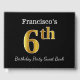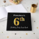 El diseño de este libro de huéspedes incluye el número ordinal "6º" con un aspecto falso dorado. También cuenta con un nombre personalizado y un fondo de color negro. Se podría usar en un fiesta para alguien que celebre su sexto cumpleaños. [~Z0000054]