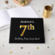 El diseño de este libro de huéspedes incluye el número ordinal "7º", con un aspecto falso dorado. También incluye un nombre personalizado y un fondo de color negro. Se podría usar en un fiesta para alguien que celebra su séptimo cumpleaños. [~Z0000054]