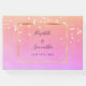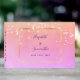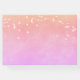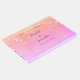 Suaves colores arcoiris, violeta, púrpura, rosa, dorada melocotón con pájaros blancos volando por encima. Un delgado marco de oro falso en la parte delantera. Plantillas de nombres y fecha de la boda. Letras moradas. Espina: agrega tu propio texto.