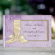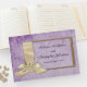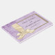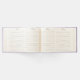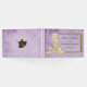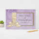 Este encantador libro de bodas morados presenta una temática de boho, con un diseño muy rústico con un diseño de pergamino morado como lienzo. En la parte delantera hay un falso marco de madera, decorado con una gran cinta de satén blanca en el lado izquierdo. También hay un par de campanas bodas en la espalda. Todos los detalles se pueden personalizar según convenga.