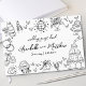 Quirky Esbozos A Mano De Un Exquisito Libro Boda. Este diseño creativo y lúdico es perfecto para las parejas que desean un conservador único y alegre para su día especial. Diseñado en una atemporal paleta en blanco y negro, el libro de invitados presenta divertidos ilustraciones dibujados a mano que fluyen dinámicamente por el frente, la espalda y la columna vertebral para un aspecto cohesivo y artístico. En la cubierta se exhiben extractos caprichosos de elementos bodas, entre ellos una brillante bola de disco, campanas bodas, una cámara vintage, una torre de champán, corazones, un pastel coronado, flores y un coche "Just Married", que le confieren al diseño un ambiente animado y elegante. En la parte superior, las palabras "Guía del Boda" se muestran en una mezcla de guiones y tipos de letra manuscritos. A continuación, se presentan de forma destacada los nombres de la novia y del novio, así como la fecha del boda. En la parte trasera, un simple monograma inicial de las primeras iniciales de la novia y el novio vincula el diseño con el resto. La columna vertebral incluye sus nombres y fecha de boda, lo que hace de este libro de visitas una adición hermosa y memorable a su celebración. Todo personalizable para adaptarse a su estilo, está disponible como un keepsake impreso.