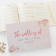 Celebra tu amor en flor total con este libro de Bodas de cerezos de primavera rosada. Las delicadas flores rosadas y las elegantes ramas sakura, traídas a la vida en acuarela, capturan perfectamente el espíritu de la primavera. Con un toque de escritura moderna de caligrafía y un diseño elegante y caprichoso, este libro de huéspedes le aporta un toque femenino y romántico a su día especial. Aprecie los deseos y mensajes más sentidos de sus seres queridos en este maravilloso quiste.