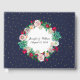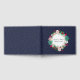 libro de bodas bonitos hecho en azul marino, con gráficos de puntos de confeti dorados. Un área de texto floral de una corona floral de bonito, en la parte delantera del libro, tiene texto personalizado listo para personalizar.