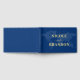Mapa del mundo azul oscuro y amarillo redondeando el libro de bodas para una boda de destino.