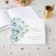 Boda Guest Book con flores blancas pequeñas. Flores abstractas dibujadas a mano sobre un fondo verde azul. Suave pintura ornada floral de acuarela. Resumen de fondo natural con ramas florales de gypsophila. Hermosas ramas florales, flores elegantes, diseño floral primaveral o veraniego, ramo romántico. Parcela botánica. Delicado libro de Bodas de botánica de flores. Colección de flores blancas pequeñas.