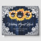 Complemente su fiesta de bodas rústica de color azul marino con este libro de bodas azul marino y girasol con flores de girasol y encaje floral blanco sobre un fondo rústico de madera. Elementos coincidentes disponibles.