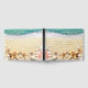 Libro de invitados de bodas de destino de playa rústico con la costa del océano, arena cálida con un toque vintage, dos estrellas de mar, conchas y un elegante patrón de texto.