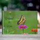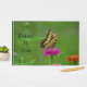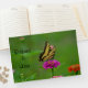 Este libro de invitados incluye una mariposa de bonito recolectando néctar de una flor rosa de zinnia.