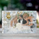 Espumosos adornos de árboles dorados y plateados rodeados de follaje festivo de color verde salado, con nieve recién caída en un maravilloso país invernal, para su día de bodas con temática de Navidades.