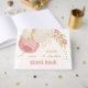 Flores románticas rosas y blancas con hojas de oro libro de boda botánico Los detalles del purpurina son simulados.