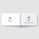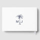 Personalizar este libro de bodas de playa tropical con tu propio toque especial. Este moderno diseño azul marino y blanco incluye nombres de novios, iniciales, fecha boda y una artística palmera.