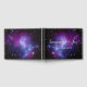 Una foto de un racimo de galaxia azul y púrpura con una caligrafía contemporánea blanca gracias al diseño boda. Crea tu propio libro de personalizados. La foto de atrás es una imagen espejo. Si lo prefiere, puede copiar una de las versiones de esta imagen de espacio en la parte delantera y trasera. Personalizar de crear su propio diseño para complementar el tema en su boda planetario.