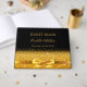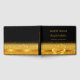Elegante, clásico, glamuroso y femenino. Cinta de color dorado falso con un arco con purpurina de imitación dorada y brillo, un poco ostentoso y lujoso. Un libro de visitas para su boda. Los nombres están escritos con un guión de estilo con letras a mano de moda dorado. Fondo negro. Espina: plantilla para tu propio texto.