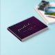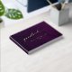 Un libro de firmas para invitados de boda elegante y sofisticado con acuarela violeta púrpura y dorado que presenta caligrafía con relieve dorado con sus nombres en una fuente moderna san serif en las cubiertas frontal, posterior y lomo.
