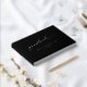 Un elegante y sofisticado libro de bodas en negro y plateado que incluye caligrafía de Relieve metalizado plateado con sus nombres en una moderna fuente san serif en el frente, columna vertebral y cubierta trasera.