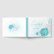 flores románticas turquesas y blancas en un libro de bodas geométrico.