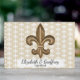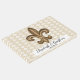 libro de visitas boda con un gran símbolo de fleur de lis dorado y un patrón de fleur de lis blanco más pequeño sobre un color de fondo beige neutro. Incluye los nombres de la pareja.