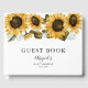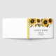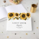 Un libro de visitas con temática rústica y floral sobre una ducha de bebé, que incluye un ilustracion acuarela de girasoles con aliento de bebé.