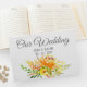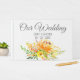 Este bonito y elegante libro de visitas incluye ramo de rociado de rosas en naranja y amarillo veraniego, con texto totalmente personalizable en fuentes grises complementarias sobre fondo blanco.