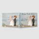 Cute bride and groom standing on beach sand with watercolor ocean background.