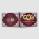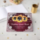 Complemente su rústico campo, patio trasero, jardín, o fiesta de bodas con granero con este libro de bodas burdeos y girasoles con flores de girasol sobre un fondo de madera de granero adornado con luces de cuerda y encaje floral blanco. Elementos coincidentes disponibles.
