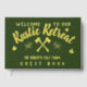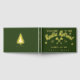 "Bienvenidos a nuestro retiro rústico" texto con espacio para sus palabras personalizados, más "libro de invitados". El diseño incluye hachas cruzadas, ramas de pino, hojas y un árbol de pino en la parte posterior - fondo verde oscuro del bosque con texto e imágenes reales de Relieve metalizado dorado.