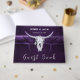 Este libro de bodas occidentales presenta un cráneo de vaca toro con un diseño rústico de fondo rústico de vaquera de color morado oscuro. Antigua casa de campo inspirada en la antigua y salvaje época de estilo occidental. Guay, un animal de granja moderno. Derechos de imagen de Marg Seregelyi Photography.