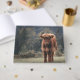 Fotografía del campo de hierba de ternera de vaca de la región montañosa del otoño. Impresionante ternera joven de ganado escocés de las tierras altas en un campo de hierba otoñal con colores tenues. Hermoso abrigo naranja peludo oscuro que contrasta con el césped verde claro amarillo y los árboles en el fondo.