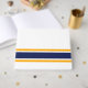Este diseño deportivo presenta rayas flotantes amarillo dorado brillantes que resaltan una banda horizontal de borde inferior azul marino muy vibrante contra un fondo blanco.