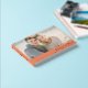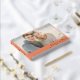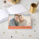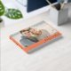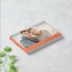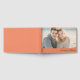 This wedding guest book features a warm and inviting design with a photograph of two individuals sitting closely on a sandy beach, capturing a moment of companionship. The layout includes a vibrant orange border at the bottom, where elegant cursive typography spells out "Spitlary and Flowers," adding a touch of sophistication. The color palette combines soft natural tones from the photo with the bold orange accent, creating a cheerful and relaxed atmosphere. Perfect for a beach-themed wedding, this design evokes feelings of joy and togetherness, making it an ideal keepsake for guests to contribute heartfelt messages.