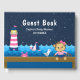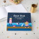 Este bonito y divertido libro de visitas incluye un mono marinero chica en una terraza de madera con gaviota y cangrejo. Al fondo, un faro rosa y blanco, un bonito pájaro en un velero, olas del océano y un cielo estrellado azul marino. El texto combina fuentes audaces y serif para un estilo elegante y moderno. Es ideal para una ducha de natación con temática náutica.