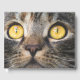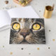 El diseño presenta un retrato fotográfico de un gato con ojos distintivos.