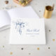 This classic and romantic design is a modern adaptation of an historic French etched ornament of dusty blue ribbon bow with foliage ca 1770 by Rococo designer Pierre Ranson. It includes customizable text fields and a complementary floral graphic on the back.