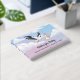 Stork carrying a baby in a bundle. Customizable text.