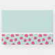 Un libro de visitas para una ducha de bebé con un capricho blanco sosteniendo un gran globo rosa flotando en el aire. Los círculos de puntos de polka rosa crean un borde bonito y encantador. Está situado sobre un fondo azul-verde claro.