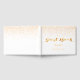 Un libro de invitados para una glamorosa fiesta de cumpleaños Sweet 16. Un fondo blanco de moda con un confetti dorado rociado. El texto: Libro de invitados está escrito con letras de oro falsas. El nombre se escribe con un guión de estilo con letras a mano. Plantilla para el texto en la columna vertebral.