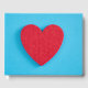 Este diseño presenta una imagen de un corazón rojo brillante que originalmente estaba hecho de fieltro; está colocado sobre un fondo azul claro.
