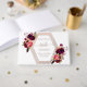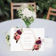 Un elegante fondo blanco, texto de lámina de oro rosa. Decorado con un marco geométrico y flores en burgundy y rosa. Personalice y agregue el nombre de la novia, texto/fecha.