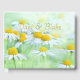 frondosos prados de encantadoras margaritas forman el frente y la parte trasera. El amarillo dorado de los centros de las flores quemadas en oro está en un tipo de letra florido y fácil de leer para los nombres de la pareja, los honorarios o el negocio, ya que estas alegres flores son muy adaptables.