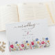 Este libro de visitas colorido presenta una cubierta adornada con un cautivador diseño de flores silvestres de jardín boho. Las flores silvestres, en tonos de rosa, amarillo y azul, crean una escena animada y pintoresca, que marca el tono para una celebración vibrante y natural. Para personalizar aún más, haga clic en el enlace "personalizar más" y utilice nuestra herramienta de diseño para ajustar esta plantilla según sus preferencias.