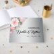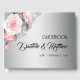 Un elegante libro de bodas plateado y rosa rosado, muy práctico para una boda en el jardín (por ejemplo), o para cualquier otro evento o lugar que prefieras. El diseño tiene un lujoso fondo de plata metálica, con un magnífico ramo de rosas rosa en la esquina. En la parte trasera hay otro ramo de rosa rosa más grande. Por supuesto, todos los detalles del frente pueden ser personalizados.