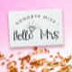 Libro de invitados sobre ducha de novias en blanco con un encantador diseño de tipografía que dice "adiós señorita hello mrs" con un diamante sobre el suelo para crear un anillo de compromiso. Añade el nombre de la novia en la columna vertebral.