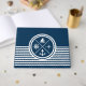 Diseño de temática náutica con símbolos náuticos (ancla, velero, velero, brújula) sobre fondo rayado blanco y azul marino.