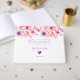 Flores rosas y violetas de acuarela moderna y linda con hojas y puntos de polka y el corazón púrpura en el medio