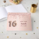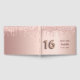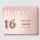 Un libro de visitas para una fiesta de cumpleaños 16, 16, glamurosa y glamurosa. Un falso fondo de oro rosa con goteo de rosa de purpurinas de imitación de oro, pinta de goteo. Personalice y agregue un nombre y una fecha. El nombre está escrito en oro rosa oscuro con una escritura de estilo moderno con letras a mano. El número 16 se escribe con un tipo de letra de estilo globo.